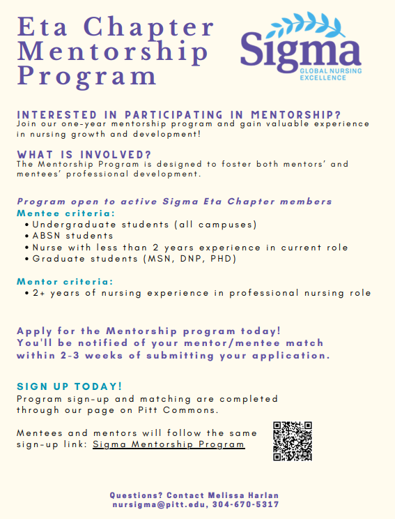 To become a mentor or mentee today, please see flyer below and scan the QR code for more information. You can also contact Melissa Harlan, program coordinator, at mdh71@pitt.edu.